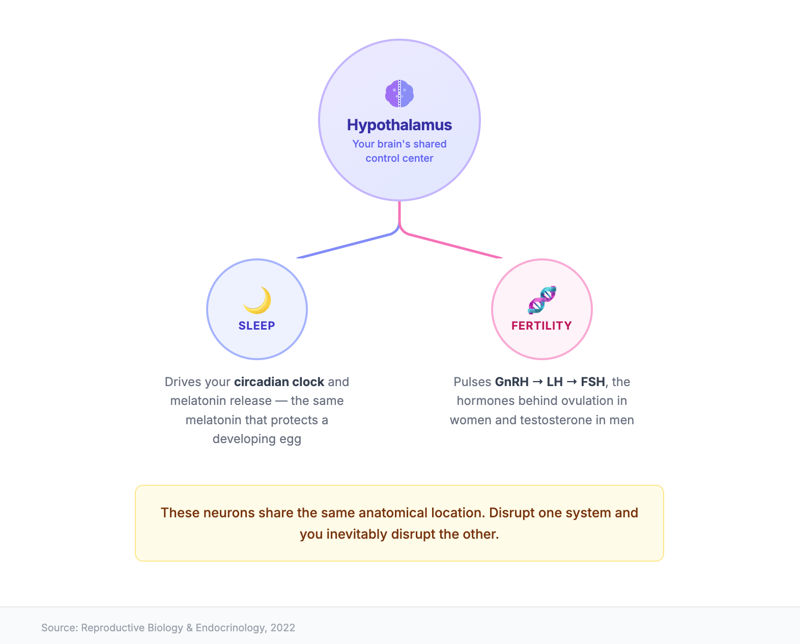 At the level of biology, sleep and fertility share real estate. The hypothalamus, the part of your brain that runs your sleep-wake cycle through the release of melatonin, is also where your reproductive hormones originate. The same control center releases the pulses of gonadotropin-releasing hormone (GnRH) that trigger LH and FSH, the hormones responsible for ovulation in women and testosterone production in men.